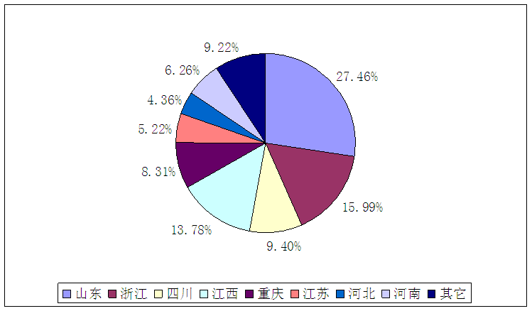 山东、浙江、四川、江西、重庆、江苏、河北、河南玻璃纤维产量分别在全国比重为 27.46%、15.99%、9.40%、13.78%、8.31%、5.22%、4.36%、6.26%。
