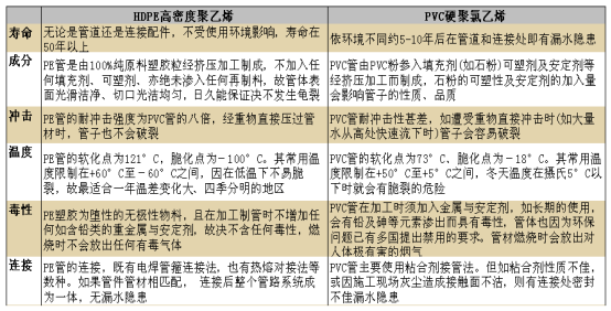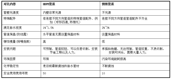 通过不同材料性能对比及成本 分析 ,可以看出HDPE的优势明显,是未来成套同层排水系统管道的重要产品,应用前景非常乐观。