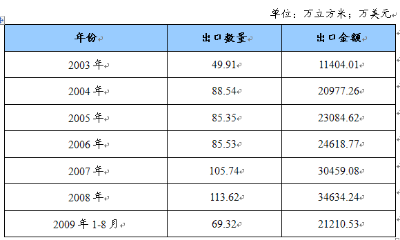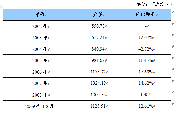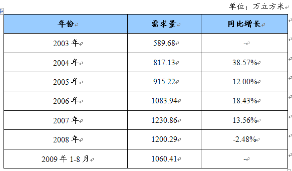 细木工板主要用于家庭及企业装修,和房地产建设息息相关,2009年1-10月,全国商品房销售面积66369万平方米,同比增长48.4%。其中,商品住宅销售面积增长50.1%;办公楼销售面积增长28.2%;商业营业用房销售面积增长32.9%。1-10月,商品房销售额31529亿元,同比增长79.2%。其中,商品住宅销售额增长84.3%,办公楼和商业营业用房销售额分别增长43.0%和53.7%。