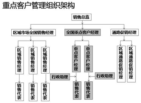 重点客户管理部门通常设有全国重点客户经理(或者总监)负责管理全国重点客户营销战略和营销计划的制定、重点客户管理团队的搭建和日常管理、重点客户营销计划的执行控制、以及与重点客户的高层保持良好的沟通和互动。