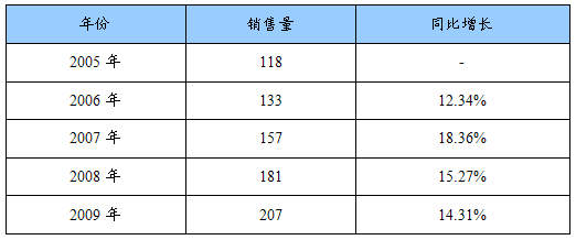 2005-2009年电子灭蚊器销售量及同比增长统计表