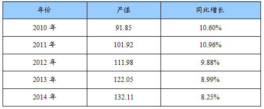 2010-2014年蚊香产值及同比增长预测表