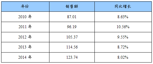 2010-2014年蚊香销售额及同比增长预测表
