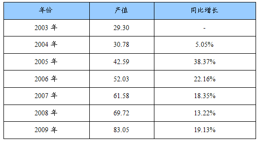 2003-2009年蚊香产值及同比增长统计表