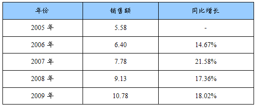 2005-2009年电子灭蚊器销售额及同比增长统计表