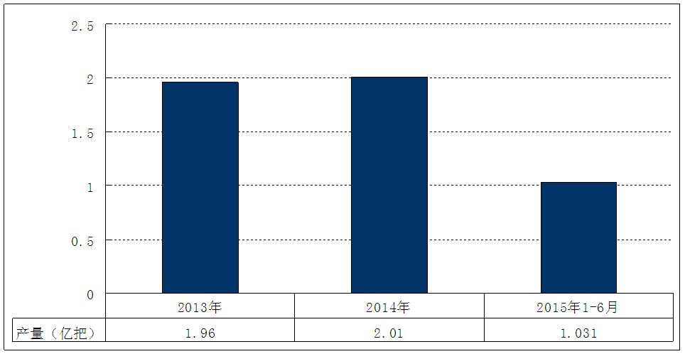 图表 13 2013-2015年6月我国旋耕刀具 行业 产量 分析
