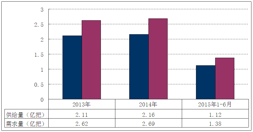 图表 21 2013-2015年6月我国旋耕刀具 行业 供需平衡 分析