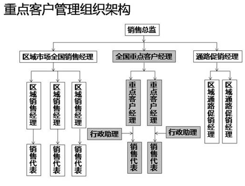 重点客户管理部门通常设有全国重点客户经理(或者总监)负责管理全国重点客户营销战略和营销计划的制定、重点客户管理团队的搭建和日常管理、重点客户营销计划的执行控制、以及与重点客户的高层保持良好的沟通和互动。