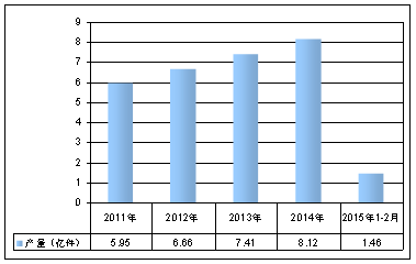 图表 15 2011-2015年2月我国运动护具 行业 产量 分析