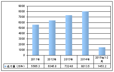 图表 21 2011-2015年2月我国运动护具 行业 出口量 分析