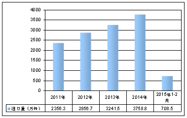 图表 20 2011-2015年2月我国运动护具 行业 进口量 分析