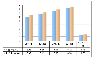图表 22 2011-2015年2月我国运动护具 行业 供需平衡 分析