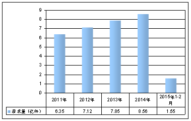 图表 18 2011-2015年2月我国运动护具 行业 需求量 分析