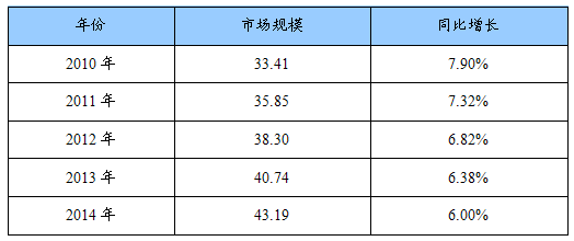 2010-2014年细胞培养反应器市场规模及同比增长预测表