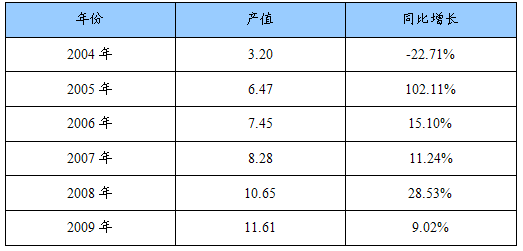 2007-2009年细胞培养反应器产值及同比增长统计表