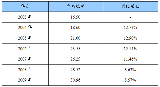 2004-2009年细胞培养反应器市场规模及同比增长统计表