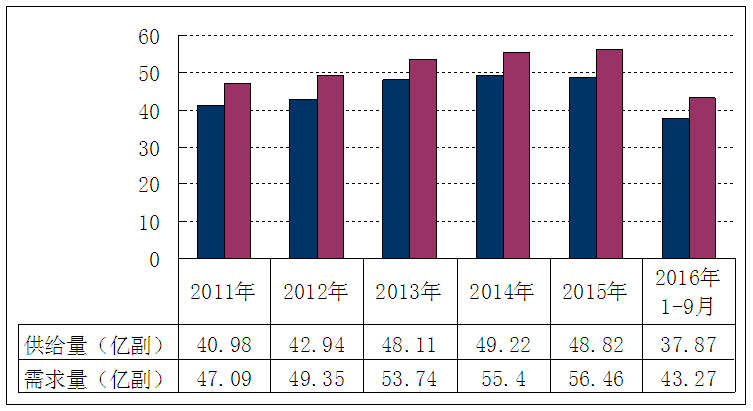 | 年份 | 产量(亿副) | 同比增长(%) |