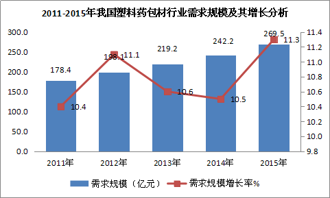 图表 17:2011-2015年我国塑料药包材 行业 需求规模及其增长 分析