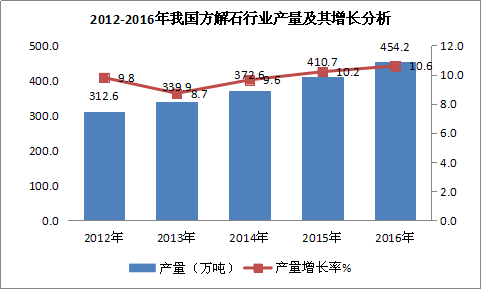 图表 13:2012-2016年我国方解石 行业 产量及其增长 分析