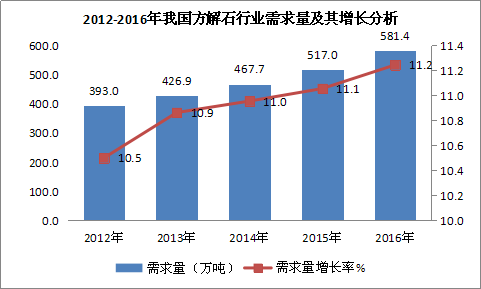 图表 16:2012-2016年我国方解石 行业 需求量及其增长 分析