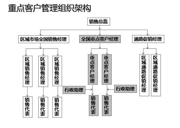 对全国重点客户经理负责的是重点客户经理,这个岗位的销售经理通常管理1-3家全国性的大型零售客户,比如雀巢就设有专门负责沃尔玛、家乐福等大型客户的重点客户经理。重点客户经理负责与客户总部的管理层、各业务部门建立紧密的日常工作联系,职责主要是:制定双方的年度联合商业计划、季度销售 分析 、季度促销的设计和执行,同时还要负责分布在全国各地的重点客户销售代表的日常管理和培训工作。如果重点客户经理负责的客户规模大,日常文案工作较多的话,通常会配备行政助理,帮助重点客户经理处理日常文案工作,让重点客户经理能够将精力集中于客户的渗透、沟通、以及对生意的计划和 分析 方面。