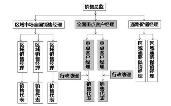 这种组织结构,是将传统的销售团队细分为三个部门:重点客户管理部门、区域市场管理部门、通路促销部门。其中重点客户管理部门专门负责大型重点客户从总部到区域直至门店的服务和管理工作,例如:家乐福、沃尔玛、国美等等。由于重点客户在公司的销售额中占比逐年增大,而且大型客户对供应商而言,具有品牌示范效应,众多的渠道批发商就是跟着大型零售商的步伐前进的,大型零售客户卖什么,批发商就推什么,同时大型客户的管理需要较高的沟通、 分析 和计划能力,因而实践中企业往往将销售队伍中的精英力量调集到重点客户管理部门工作。