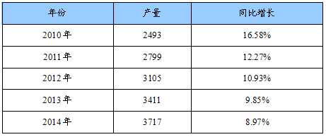 2010-2014年我国电力电缆产量预测表