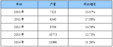 2010-2014年我国光缆产量预测表