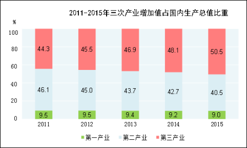 图表 32:2011-2015年三次产业增加值占国内生产总值比重