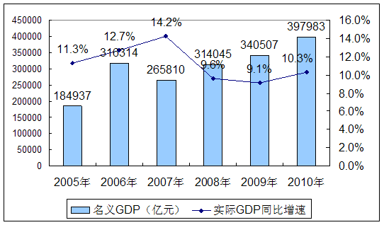 由上图可知,近年来我国国内生产总值(GDP)一直保持高速增长,增长幅度均超过了9%。虽然受世界性经济危机的影响,我国2008和2009年的GDP增长幅度有所下降,但2010年的经济增长幅度出现回升。