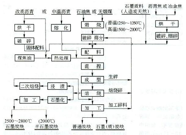 各国生产石墨阴极炭块制品所采用的工艺流程和设备基本相同。不同厂家生产的不同制品,往往有其独特的配方。原料经煅烧、破碎、筛分成—定的粒级,按配方计量后加入黏结剂进行混捏,完成混捏即为成品阴极糊。混捏后的糊料经成型、焙烧甚至石墨化、机加工等工序。阴极糊—般与阴极炭块配套生产和使用。它们使用相同的原料和统—的生产工艺和设备。