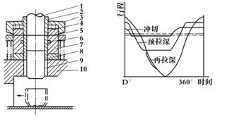 能否实现变薄拉深,模具是关键,各次成型加工的模具是不同的。现代制罐机中多采用复合式制罐模具。这种模具设计与制造要求较高,以便承受成型加工的冲击力和压应力,并保证加工质量和模具寿命。图示为冲切-冲压预拉深-再拉深复合模具的结构,图右曲线为该模具的冲床滑块行程曲线。该模具一次冲压加工能完成冲切、预拉深和再拉深。变薄拉深和成型复合模具,一个行程可完成变薄拉深三次而成型。