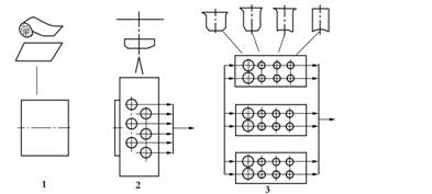1-坯料供给装置; 2-六工位压力机; 3-双动拉深压力机
