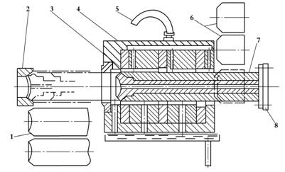 1-成品; 2-罐底成型模; 3-变薄拉深环; 4-模具壳体;5-胶管; 6- 再拉深所得杯筒; 7-冲头模; 8-滑块
