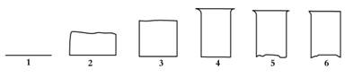 1-板坯; 2-预拉深杯; 3-第二道拉深杯; 4-第三道拉深杯; 5-整形与压低成型加工; 6-冲切修整