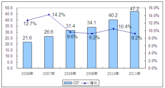 初步核算,2011年全年国内生产总值471564亿元,比上年增长9.2%。其中,第一产业增加值47712亿元,增长4.5%;第二产业增加值220592亿元,增长10.6%;第三产业增加值203260亿元,增长8.9%。第一产业增加值占国内生产总值的比重为10.1%,第二产业增加值比重为46.8%,第三产业增加值比重为43.1%。