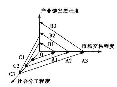 如图所示,产业链的形成首先是由社会分工引起的,在交易机制的作用下不断引起产业链组织的深化。在图中,C1、C2、C3表示社会分工的程度,其中,C3>C2>C1表示社会分工程度的不断加深;A1、A2、A3表示市场交易的程度,A3>A2>A1表示市场交易程度的不断加深;B1、B2、B3表示产业链的发展程度,其中,B3>B2>B1表示产业链条的不断延伸和产业链形式的日益复杂化。三个坐标相交的原点0,表示既无社会分工也无市场交易更无产业链产生的初始状态。