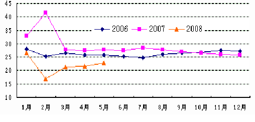 2006-2008年各月出口累计同比增速对比