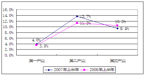 2007、2008年上半年国民产业同比增长率比较