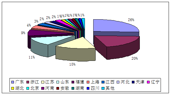 2006年我国服装出口前五位的省市为广东省、浙江省、江苏省、上海市和山东省,这五省市出口金额占服装总出口的76.70%。