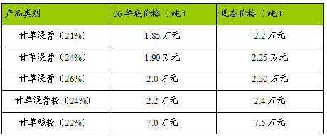 甘草系列提取物国际的需求依然成增长趋势,从2005年10月以来,国家已经确定了甘草准许经营和出口企业,在加强了对甘草制品的合法合理生产销售的监控,同时是甘草系列提取物的出口受到一定的限制。国际的旺盛需求和国内的适度限制出口,使甘草系列提取物成为“宠儿”,价格火热提升,估计价格还将继续上涨。作为民族医药产业中的特色植物药,我们希望甘草系列提取物获得它该有的价值,以下表格显示目前价格变化情况。