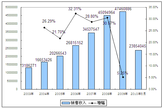 由数据可以看出,03-09年我国医用离心机产品所属 行业 市场增长速度很快,虽然07年有所减缓下降。我国加大基础 行业 投资投入,所以又快速增长起来,以及 行业 振兴计划的出台,未来几年我国医用离心机产品所属 行业 仍将保持快速增长。