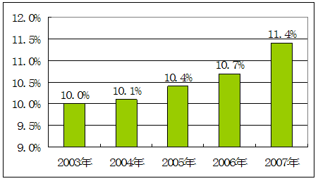 从2003年开始,我国经济增长率一直在10%平台上加速。2003年的增长率为10.0%,2004年为10.1%,2005年为10.4%。2006年我国GDP为209407亿元,增长10.7%,增速比上年加快0.3个百分点,2007年中国经济增长11.4%,是14年来的最大增幅。