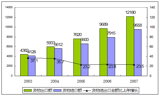 全年货物进出口总额21738亿美元,比上年增长23.5%。其中,货物出口12180亿美元,增长25.7%;货物进口9558亿美元,增长20.8%。出口大于进口2622亿美元,比上年增加847亿美元。