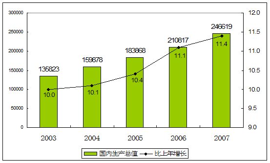 2007年全年国内生产总值246619亿元,比上年增长11.4%。分产业看,第一产业增加值28910亿元,增长3.7%;第二产业增加值121381亿元,增长13.4%;第三产业增加值96328亿元,增长11.4%。第一产业增加值占国内生产总值的比重为11.7%,与上年持平;第二产业增加值比重为49.2%,上升0.3个百分点;第三产业增加值比重为39.1%,下降0.3个百分点。分季度看,一季度增长11.1%,二季度增长11.9%,三季度增长11.5%,四季度增长11.2%。