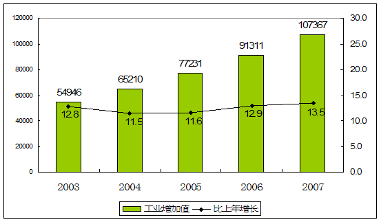 全年全部工业增加值107367亿元,比上年增长13.5%。规模以上工业增加值增长18.5%,其中国有及国有控股企业增长13.8%;集体企业增长11.5%,股份制企业增长20.6%,外商及港澳台投资企业增长17.5%;私营企业增长26.7%。分轻重工业看,轻工业增长16.3%,重工业增长19.6%。