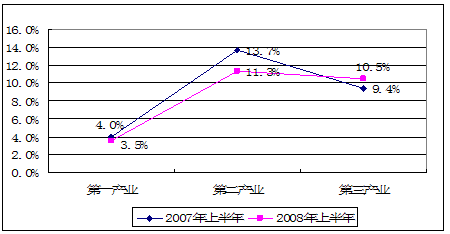 2008年上半年我国国内生产总值130619亿元,同比增长10.4%,比上年同期回落1.8个百分点。其中第一产业增加值11800亿元,同比增长3.5%,比上年同期回落0.5个百分点;第二产业增加值67419亿元,同比增长11.3%,比上年同期回落2.4个百分点;第三产业增加值51400亿元,同比增长10.5%,比上年同期回落1.6个百分点。