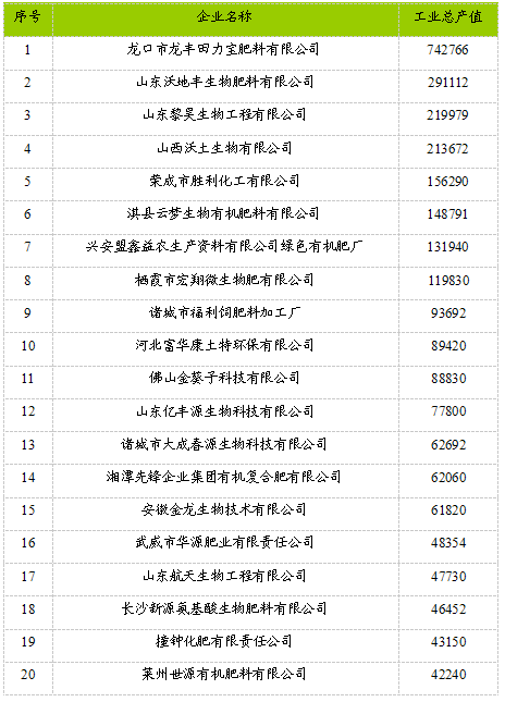 2006年有机肥料及微生物肥料 行业 工业总产值前20位企业