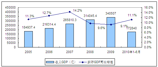 2005年-2010年2季度我国GDP增长变化情况