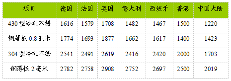 亚洲地区冷轧奥氏体不锈钢板卷市场竞争相当激烈,如:韩国产的304型冷轧奥氏体不锈钢0.8毫米板卷在中国南方港口到岸报价每吨2500美元,而该不锈钢2毫米板卷到岸报价每吨大约为2300美元。中国大陆当地不锈钢生产厂生产的冷轧奥氏体不锈钢2毫米/2b板卷,在未扣除购买数量的折扣之前和征收17%增值税之后的销售价,8月底和9月初为每吨22000元人民币。